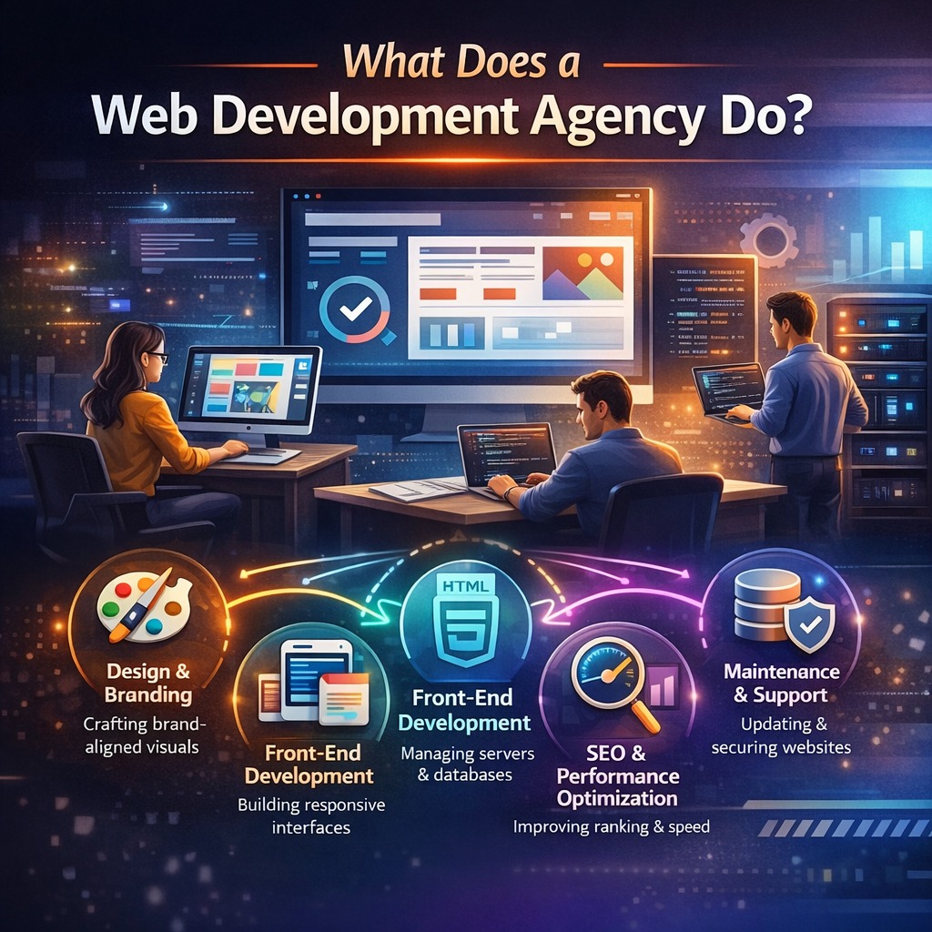 A web development agency specializes in creating and maintaining websites tailored to your business goals. They combine design, coding, and strategic planning to deliver a functional, visually appealing, and user-friendly site.